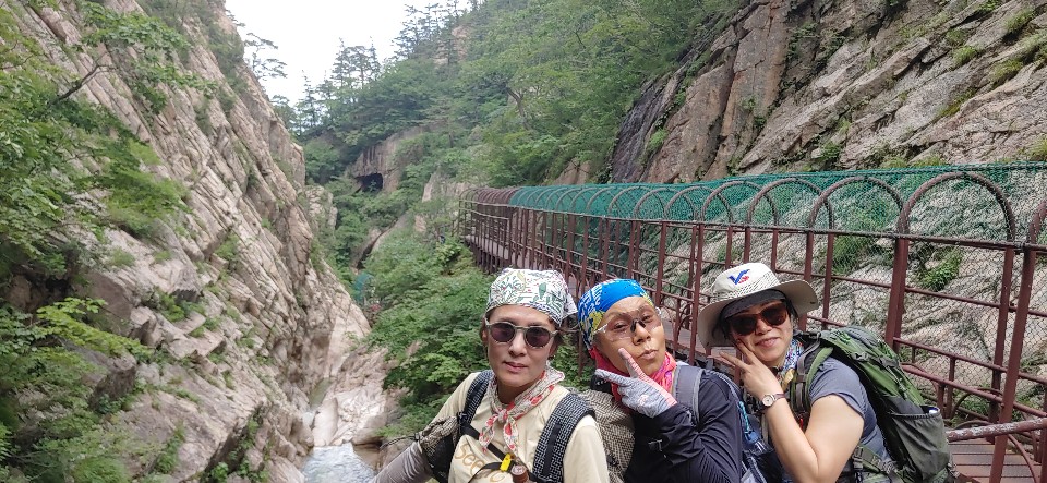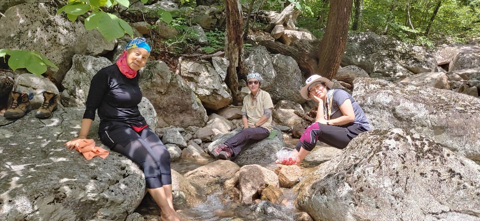 천불동 계곡을 거쳐 비선대 계곡을 지나서 시원한 계곡에 발담그고 휴식.