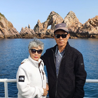 새파란 바다를 배경으로 찍은 모습은