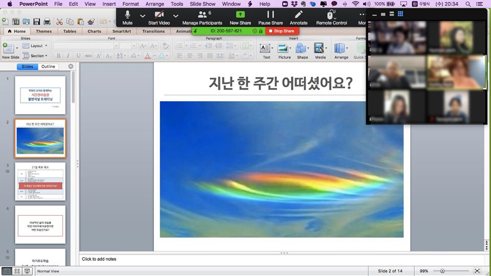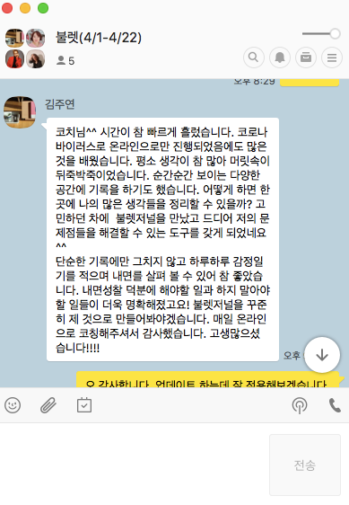 드디어 4번째 온라인 미팅 시간, 그리고 총 21일 여정의 마지막 시간이었어요. 21일 동안의 변화를 나누었어요. 처음에는 계획한 만큼 하루 일정을 보내지 못했다고 낙담했으나 곧 우리가 처음 만났을 때를 떠올리며 웃을수 있었습니다. 변화는 하루의 우선 순위가 분명해지고, 그날그날 어떤 주요한 일들이 있었고 어떤 마음을 가졌는지 기록을 보며 지난 시간 점검을 할 수 있었다고요. 매일 밤 성찰노트를 통해 일상에 감사하는 마음이 들었다고 합니다. 불렛저널은 효율적인 시간관리를 기대하며 시작했지만, 마무리 때 바라보니 자기성찰의 인생 노트법을 배웠다는 소감이 울림이 컸어요. 큰 목표는 퓨처로그와 먼슬리로그로 다루고 매일 실현가능한 목표는 데일리로그로 쪼깨어 작은 실천 단위로 만들고, 매일 리뷰를 통해 성찰하고 ..